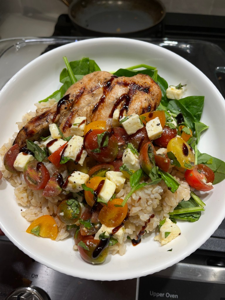 Grill your chicken and serve with caprese salad. Can also include spinach and brown rice (as pictured), or substitute cauliflower rice for the brown rice. Simple and delicious Summer meal!